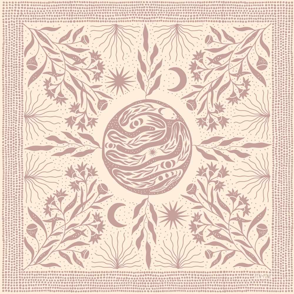 This 22” cotton bandana celebrates the southwest - with desert plants, a soft sandy color, and a neutral color scheme. The illustration is silk screened with water-based ink in sandy pink on a natural, cream colored bandana.